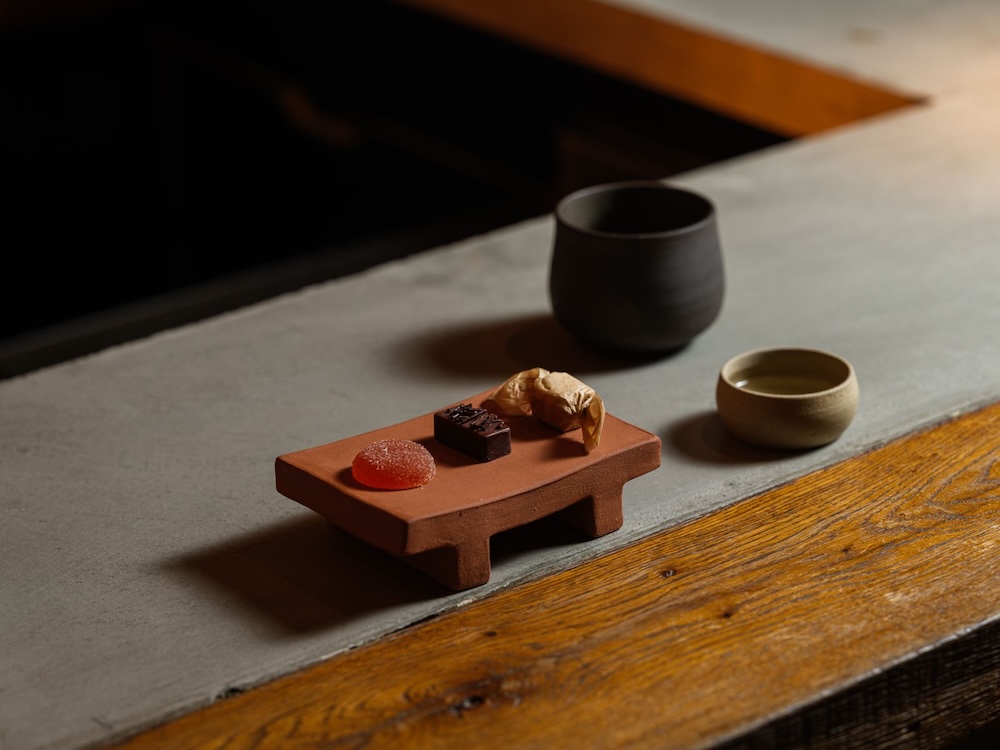 Dessert is a yoghurt sorbet lollipop, pink and dusted with Scotch bonnet chilli and foraged wood ants. A sweet wine from Jurançon with a final pudding built around koji and caramelised apple arrives next – dense like sweetcorn cake, but also cloud-soft and reminiscent of coconut flesh. The flavours echo earlier courses. The meal ends with a box of petits fours, our favourite a fudge that tastes like popcorn, studded with rye crunch. The final drink is KOL’s house mezcal, Verde, sourced from Mexico and poured from a bespoke bottle produced for the restaurant.
